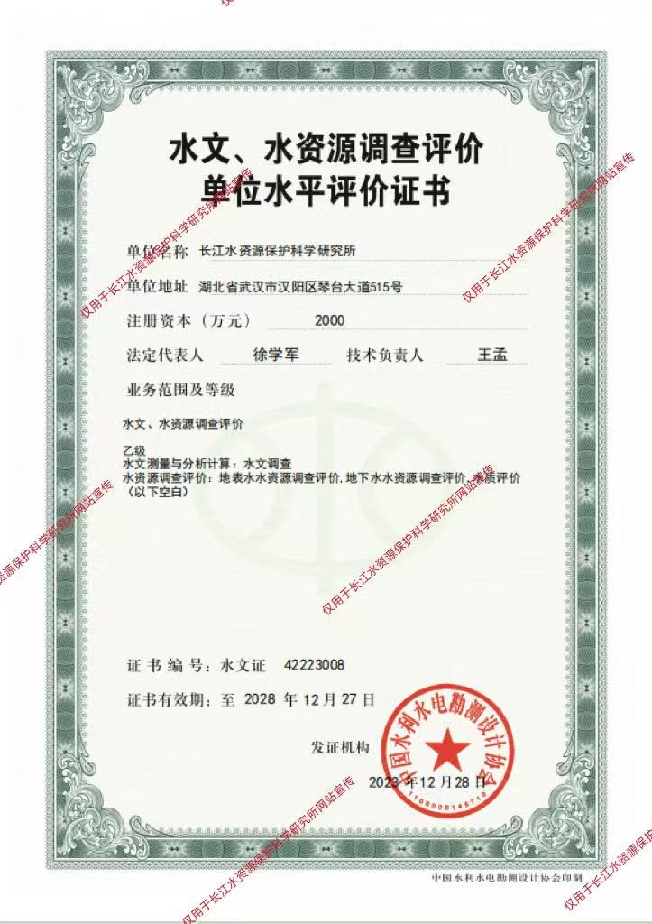 水文、水资源调查评价单位水平评价证书